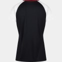 Le design du t-shirt se caractérise par une couleur noire dominante, agrémentée de traits rouges et blancs sur le torse, apportant une touche dynamique. Les épaules blanches ajoutent un contraste élégant, faisant de ce t-shirt un choix parfait pour les sportives soucieuses de leur apparence et de leur confort.
